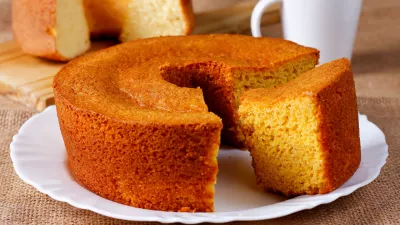 Homemade corn cake on white plate on rustic wooden table. Typical Brazilian party food. Selective focus / Foto: Gilnature