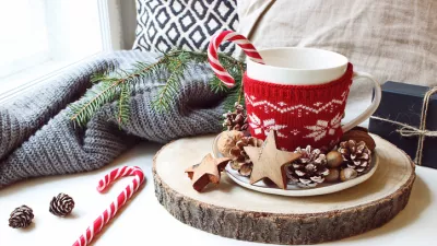 Winter morning breakfast still life scene. Cup of coffee, tea with candy canes standing near window on wooden cut board. Decorated by pine cones, hazelnuts and wooden stars, Christmas concept.