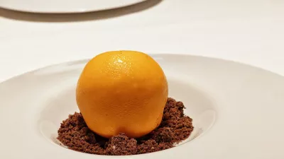 Predsladica je pomarančna, bolj sladoled kot sorbet, sladica pa je na prvi pogled videti kot čisto prava mandarina. A le na prvi pogled – v resnici je »lupina« obarvana bela čokolada, polnjena je z nasitno kremo in mandarinino sredico ter postavljena na čokoladni drobljenec. V kozarcu se je zraven vrtela Corona Grande, elegantno sladko vino iz kleti Benvenuti.