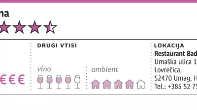 Badi je prijetno urejen lokal, zunaj ga obkroža džungla rožmarina in orjaške agave, jedilnica je prostorna, moderna in udobna. Ni dvoma, da je to restavracija, ne konoba. Strategija Istre, moderne pokrajine s poceni konobami in tradicionalnimi hiškami, ki so si jo domačini in predvsem njihov idejni vodja Denis Ivošević pred leti zamislili, se je v zadnjih letih krepko spremenila.