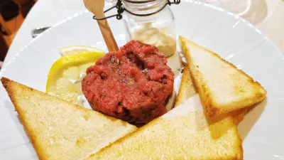 Ob vseh testeninah pa za zmerno ceno, kot smo omenili, ponudijo tudi ducat glavnih jedi, med njimi račko, omenjeni tournedos, lososa in jagenjčka. Našo pozornost je še posebej pritegnila konkretna porcija tatarskega biftka (14 evrov), ki ga naši sosedje radi strežejo kot glavno jed. Marsikje ga tudi rahlo popečejo, v Čedadu pa je bil surov, praktično brez začimb in torej povsem prvinski. Ob kruhu k mesu pristavijo še sijajno gratinirano zelenjavo, ob našem obisku so bili to koromač, mladi grah in ohrovt. Govedina v tatarcu sicer pripada sloviti italijanski pasmi fassona iz Piemonta, malce presenetljivo pa menijo, da gre zraven tudi majoneza, zelo začinjena, kot nekakšna rahla tatarska omaka. Vrhunska jed, zraven katere gre piti recimo kak merlot; hišni stane le dva evra, najboljši ali najdražji merlot na karti vin z gričkov v okolici Čedada pa iz kleti Livia Felluge sprejemljivih 45 evrov.