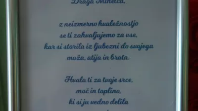 Veliko srce ima tudi Mihelca, ki je možu ves čas stala ob strani in ustregla prav vsaki njegovi želji. Dokaz o njeni nezmerni ljubezni in požrtvovalnosti do pokojnega moža je zapisan na uokvirjenem listu belega papirja, ki stoji ob Brankovi fotografiji in sveči. Njuni otroci ter Brankova brat in sestra so se namreč Mihelci pisno zahvalili za vse, kar je storila iz ljubezni do svojega moža, atija in brata. »Hvala ti za tvoje srce, moč in toplino, ki si ju vedno delila z nami,« so zapisali ganljivo.