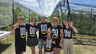 Družina Trstenjak v nasadu jablan. / Foto: osebni arhiv
