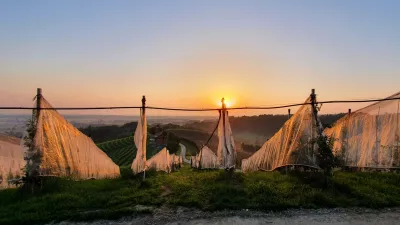 Nasad kmetije Trstenjak, pokrit z belimi »zavesami«, kar je inovativen način ekološke zaščite jablan pred insekti. / Foto: osebni arhiv