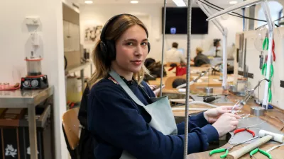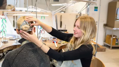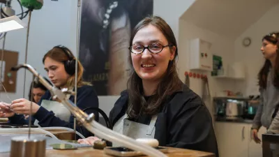 Študentka drugega letnika oblikovanja tekstilij in oblačil na Naravoslovnotehniški fakulteti Jerca Perne je iz drevesnega lubja in kovine izdelovala obesek. Šivalni stroj je zamenjala za žago in pilo. »Nakit izdelujemo v okviru izbirnega predmeta. Dobili smo nalogo, da ga ustvarimo iz povsem običajnih stvari, ki jih najdemo doma ali v naravi. Najprej je bila ideja, nato skica, sledil je prototip in zdaj je na vrsti izvedba,« je razložila in dodala, da je nakit zanjo način izražanja. »Rada imam 'odbit' nakit, ki pritegne pozornost, doma imam denimo ogrlico iz starega jedilnega pribora. Sicer pa je moj izbor nakita odvisen od priložnosti. Če grem v klub, si bom nadela nekaj opaznejšega, za vsak dan nekaj bolj minimalističnega, kot gostja na poroki kaj elegantnejšega,« je pripovedovala med piljenjem in ovrgla prepričanje, da mladi danes nimajo več odnosa do ročno izdelanega nakita.
