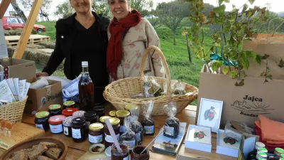 Andreja Kozmus in Darja Štirn na stojnici, ki se je šibila od zdravja. Drenov čaj, drnulovc, drenova marmelada, sadike drena ... / Foto: Katja Petrovec
