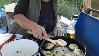 Na stojnici Tanje Gobec je že prijetno dišalo. Gospa iz Šentjurja je namreč pripravila pirin zavitek, polnjen s pire krompirjem in prostorastočimi rastlinami s travnika. Rman, trpotec in travniški pastinak, je pokazala na mešanico rastlin. »Lahko pa seveda dodamo, kar koli užitnega nam pride pod roke. Rastline nasekljam, dodam olivno olje, sol in začimbe, namažem na testo in spečem,« je razkrila postopek.
