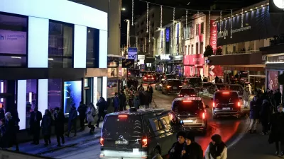 This photograph taken on January 20, 2026 shows pedestrians and traffic in downtown Davis on the sidelines of the World Economic Forum (WEF) annual meeting. The World Economic Forum takes place in Davos from January 19 to January 23, 2026.,Image: 1067708159, License: Rights-managed, Restrictions:, Model Release: no