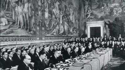 Dne 25. marca 1957 sta bila podpisana ključna dokumenta v evropski zgodovini, bolj poznana kot rimski pogodbi, s katerima sta bili ustanovljeni Evropska gospodarska skupnost (EGS) in Evropska skupnost za jedrsko energijo (ESAE ali Euratom). Podpisalo ju je šest držav članic, in sicer Belgija, Zvezna republika Nemčija, Italija, Francija, Luksemburg in Nizozemska, to pa se je zgodilo na Kapitolskem griču v Rimu. Veljati sta začeli 1. januarja 1958.