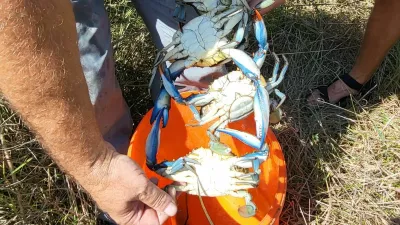 Ribič in školjkar Nevio Vižintin, ki so ga pooblastili za izlov modrih rakovic, pravi, da večji primerki tehtajo skoraj pol kilograma. / Foto: Katja Gleščič