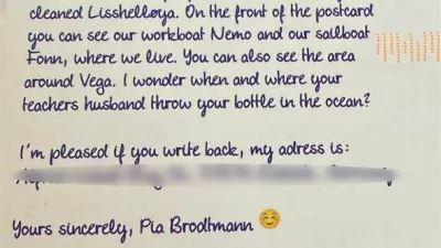 Na sprednji strani razglednice lahko vidiš naš delovni čoln Nemo in našo jadrnico Fonn, kjer živimo. Vidiš lahko tudi območje okoli Vege. Zanima me, kdaj in kje je mož tvoje učiteljice vrgel tvojo steklenico v ocean?" Dodala je še: "PS: Stara sem 27 let in zelo rada plezam in jadram!"