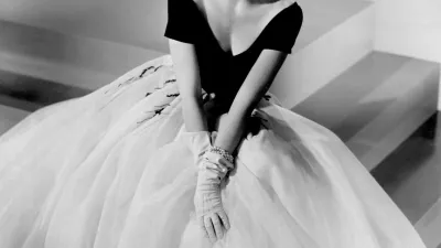 Replika ene najbolj znanih hollywoodskih oblek je sestavljena iz skoraj enakega zgornjega dela, ki razkriva ramena in poudarja postavo, ter zračnega krila iz tila (rahlo spominja na baletne kostume) do tal z razporkom ob strani – samo po tem se razlikuje od izvirnika. Tudi pas z viticami in posrebrenimi cvetlicami je skoraj enak tistemu, ki ga je v legendarnem filmu nosila Hitchcockova muza. Namesto prepoznavnih biserov, ki jih je njena babica nosila na fotografijah v tej obleki, je Camille izbrala ogrlico znamke Cartier, lase pa je spela v figo, iz katere so se mehko spuščali prameni in ji obrobljali obraz.