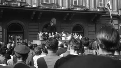 leto 1961 - 16. avgustNavdušenje ob prihodu novega evropskega prvaka v vajah na orodju Mira Cerarja v LjubljanoMiro Cerar / Foto: Marjan Ciglič