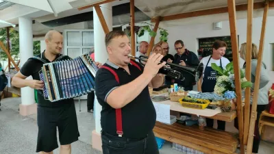 Uroš Bizjak s harmoniko in Robi Mihelin s trobento sta poskrbela za prešerno razpoloženje v turobnem vremenu. / Foto: Mojca Marot