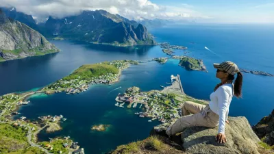 An adventurer sits atop a rocky ledge, soaking in the panoramic beauty of the Lofoten Islands as the sun rises, illuminating the tranquil waters and rugged mountains. Reinebringen Lofoten Norway / Foto: Fokkebok