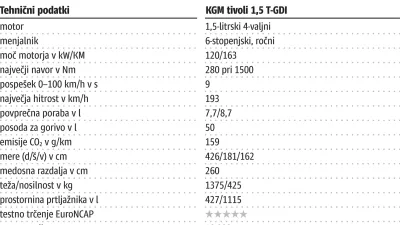 Pod sprednjim pokrovom tivoli skriva 1,5-litrski bencinski štirivaljnik, ki premore solidnih 163 konjev (120 kW) in 280 Nm navora že pri 1500 vrtljajih. Slednje pomeni, da med speljevanjem ni dobro preveč pogumno pritisniti na plin. Tudi sicer bodo od avtomobila največ imeli zmerni vozniki. To se občuti že ob obnašanju podvozja, ki je sicer uravnoteženo in čvrsto, a bolj primerno za mesto kot za gorske dirke. V mestu prav tako ne bo treba prestavljati preveč visoko. Večinoma se boste gibali med tretjo in četrto prestavo. Do pete bo šlo na praznih vpadnicah, v šesto pa zlasti na avtocesti. Najvišja hitrost tivolija je sicer 193 km/h, pospešek pa je 9 sekund. Bo pa zmogljivost motorja udarila po žepu. Med testom je povprečna poraba dosegla 8,7 litra na 100 kilometrov. To je za kompakten avto s takšno prostornino prtljažnika zelo visoka številka.