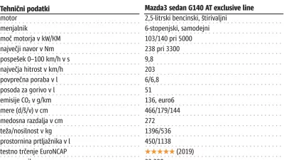 2-5-4-6-6-8. Kombinacija, ki ne odpira kakšnega sefa, temveč pojasnjuje pogonski sklop in vse, kar sodi zraven. Štirivaljni bencinski motor ima pljučno prostornino 2,5 litra in iskrivih 140 konjičkov (103 kW), ki komaj čakajo, da jih poženemo v dir. Je pa pogon na prednji kolesi speljan prek 6-stopenjskega samodejnega menjalnika, ki mu lahko strežemo tudi z ušesoma za volanskim obročem. Hitri boste, če bo takšen vaš ukaz, saj je maksimalna hitrost 203 km/h, pospešek do stotice pa 9,8 sekunde. Bolj ko boste pritiskali stopalko za plin, manj zeleni boste, se nam je pa zdela povprečna poraba 6,8 litra še v mejah sprejemljivega, doseg z enim polnjenjem pa je bil dokaj razkošnih 750 kilometrov. V mazdi3 je podobno kot v vseh mazdah lahko izrazit vonj po športnosti, kako zelo izrazit bo, pa je odvisno od dotičnega za volanskim obročem. S spoznanjem: če boste ustregli želji konjičkov po iskrivosti, bo tudi poraba narasla, posledično boste pogosteje obiskovalec na bencinski črpalki. Testna različica stane 32.390 evrov, nekoliko ugodnejšo pa jo v očeh potencialnega kupca naredi maksimalnih pet zvezdic na varnostnih trčenjih EuroNCAP. Mazda3 (ob limuzini je naprodaj še petvratna različica) ne sodi med najbolje prodajane modele na slovenskih tleh, lani so jih prodali 77, kar je bilo dovolj za 124. mesto med vsemi štirikolesniki.
