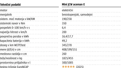 Mini aceman JCW E je zanimiva himera. Po eni strani gre za sodobnega minija, ki ga mnogi uvrščajo v kategorijo tako imenovanih lifestyle avtomobilov. Ti naj bi nagovarjali zlasti tisti del prebivalstva, ki posebno pozornost daje blišču in videzu. Po drugi strani gre za proizvod športnega oddelka znamke, ki je ime dobil po Johnu Cooperju. Slednji je dognal, da je lahek avto z motorjem spredaj popoln za dirkanje. Po njegovi intervenciji so miniji v 60. letih trikrat zmagali na prestižnem reliju Monte Carlo. Gre torej tudi za avto, ki nagovarja ljubitelje adrenalina, dirkanja in brnenja strojev. No, pričujoči mini aceman JCW E je električni. Ni pa nihče rekel, da himere niso simpatične.