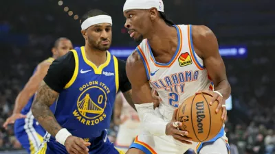 Shai Gilgeous-Alexander (desno) je tudi letos glavni favorit za najboljšega igralca lige, njegovo moštvo Oklahoma City Thunder pa za naslov prvaka. / Foto: AP