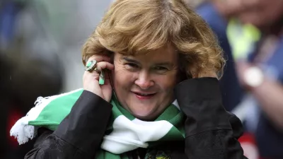 Susan Boyle performs ahead of the Champions League qualifying second round soccer match between Celtic and Helsingborgs at Celtic Park, Glasgow, Scotland, Wednesday, Aug. 29, 2012. (AP Photo/Scott Heppell)