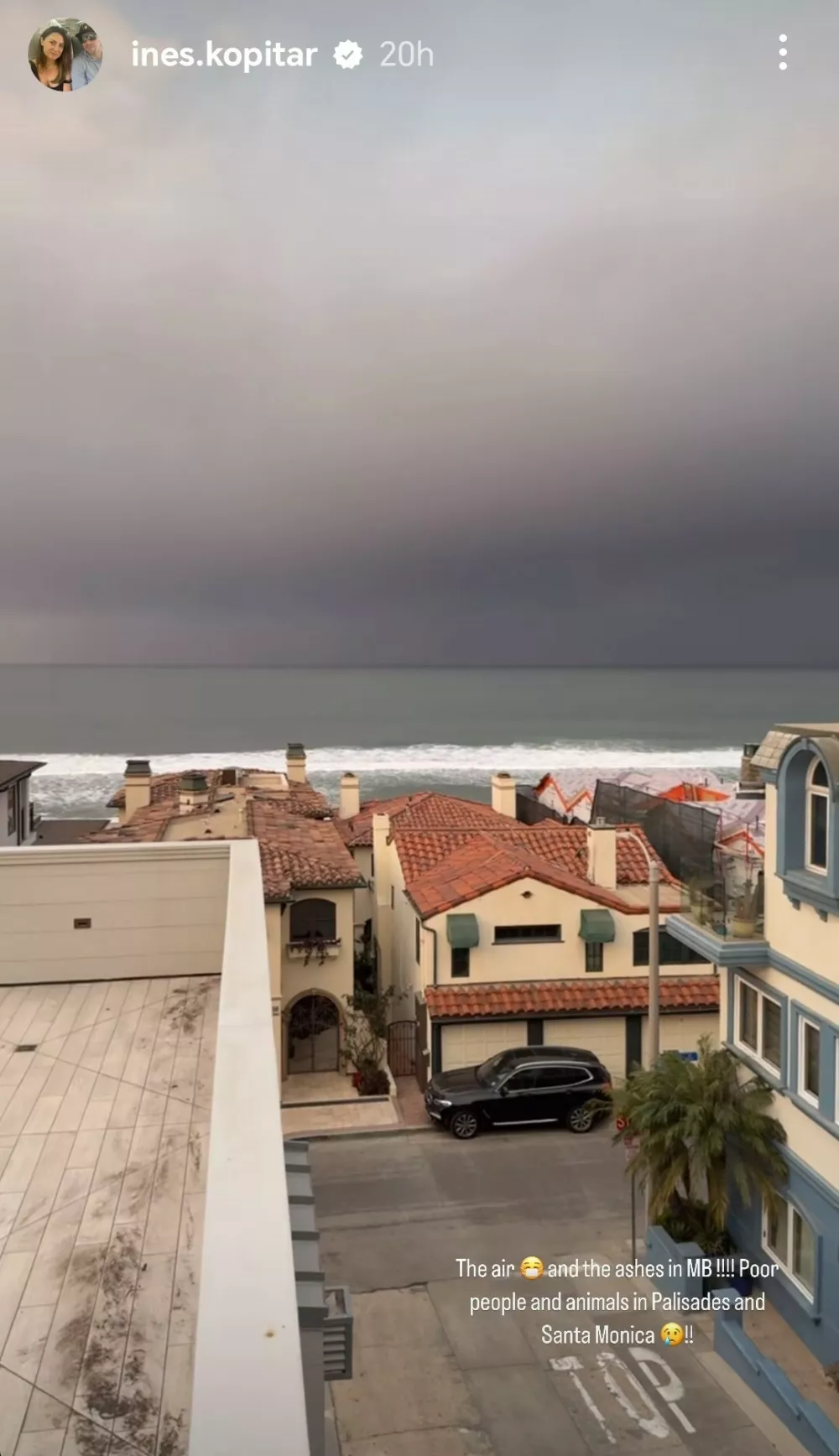 »Zrak in pepel v Malibuju. Ubogi ljudje in živali v Palisadesu in Santa Monici,« je na omrežju Instagram zapisala Ines Kopitar. Anže Kopitar z ženo in otroki živi v v Los Angelesu, dom imajo ob morju. Čeprav njuna hiša ni prav blizu območja, kjer gori, pa očitno tudi njiju skrbijo požari, s katerimi se že dva dni borijo tamkajšnji gasilci in ki so že pogoltnili 2000 hiš.