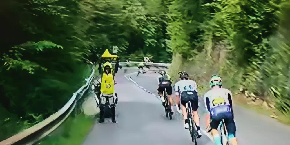 Iz agencije so nam posredovali tudi posnetek, ki ga je na trasi naredil motorist s kamero in prikazuje redarja s piščalko in zastavo, ki je v nesrečnem desnem ovinku, slab kilometer pred vasjo Grad v občini Cerklje na Gorenjskem, kolesarje opozarjal na nujno zmanjšanje hitrosti. Le nekaj minut za tem posnetkom se je žal zgodila tragična nesreča, so pojasnili v agenciji.