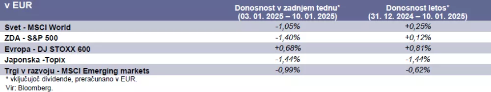 Pretekli teden se je za ameriške kapitalske trge začel obetavno, saj so se razširile novice o domnevno milejšem pristopu Trumpove administracije glede carin. Vendar je optimizem hitro splahnel, ko je predsednik Donald Trump te govorice javno zanikal. Poleg tega so nekatere ekonomske objave nakazovale, da inflacijski pritiski ostajajo visoki. Na primer, inštitut ISM je objavil decembrski indeks PMI za storitveni sektor, ki je znašal 54,1, 2 točki višjo vrednost kot novembra. Posebej skrb vzbuja indeks inštituta ISM, ki meri cene materiala in storitev plačanih s strani storitvenih podjetij, saj so te decembra poskočile za več kot 10 %. To kaže na morebitno ustavitev napredka pri zniževanju inflacije. Za dodatne skrbi je poskrbela članica odbora ameriške centralne banke (Fed), Michelle Bowman. V četrtkovem govoru je opozorila, da je inflacija še vedno »neprijetno višja« od ciljne ravni 2 %, ter poudarila, da so se, kljub pomembnemu napredku Feda v letu 2023, tveganja začela povečevati. Makroekonomski podatki za december so bili sicer pozitivni in pokazali na robustnost trga dela, a to je lahko dvorezen meč, saj močan trg dela povečuje inflacijske pritiske. Ameriško gospodarstvo je decembra ustvarilo 256 tisoč novih delovnih mest, kar je več kot 100 tisoč nad pričakovanji, stopnja brezposelnosti je upadla za 0,1 odstotne točke na 4,1 %, poleg tega so letne rasti plač dosegle 3,9 %.