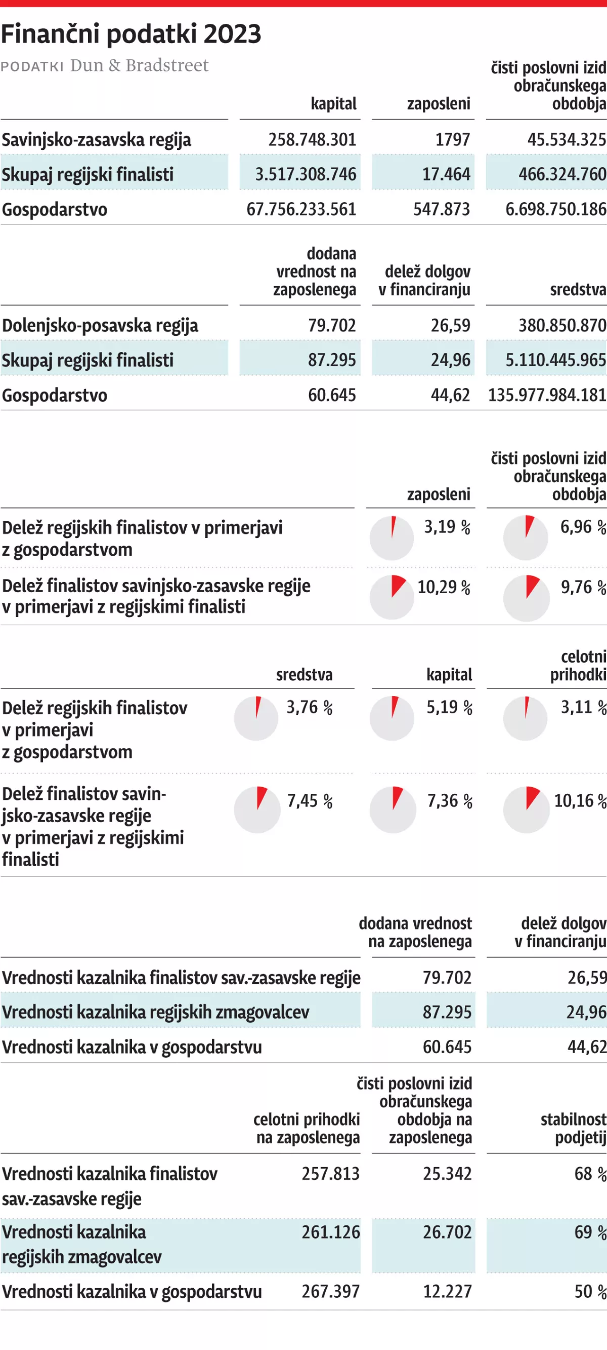 Finalisti iz savinjsko-zasavske regije pomembno prispevajo h konkurenčnosti slovenskega gospodarstva, saj v primerjavi s finalisti preostalih regijskih izborov ustvarjajo 10,16 odstotka celotnih prihodkov, 7,45 odstotka sredstev in 7,36 odstotka kapitala. Po analizi družbe Dun & Bradstreet njihova dodana vrednost na zaposlenega znaša 79.702 evra, kar je občutno nad povprečjem slovenskega gospodarstva (60.645 evrov). Podobno velja za čisti poslovni izid na zaposlenega, ta je s 25.342 evri več kot dvakrat višji od povprečja gospodarstva (12.227 evrov). To kaže na visoko produktivnost in donosnost savinjsko-zasavskih gazel. Stabilnost finalistov savinjsko-zasavske regije je izjemno dobra – z vrednostjo 68 odstotkov so za 18 odstotkov nad povprečjem slovenskega gospodarstva in le za odstotek zaostajajo za povprečno stabilnostjo finalistov preostalih regijskih izborov. Hkrati so to nizko zadolžena podjetja – njihov delež dolgov v financiranju je 26,59 odstotka, kar je precej nižje od povprečja gospodarstva (44,62 odstotka) in primerljivo s povprečjem finalistov drugih regijskih izborov (24,96 odstotka).