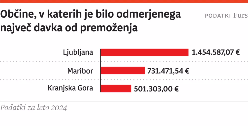 Na Fursu potrjujejo, da davek odmerjajo v vseh občinah. Na vrhu lestvice občin, ki prejmejo največ davka od premoženja, sta pričakovano obe največji mestni občini, Ljubljana in Maribor, sledi pa jima Kranjska Gora, kar je mogoče povezati z večjim številom in visoko vrednostjo vikendov oziroma stanovanj, ki se oddajajo v turistični najem. Primerjalna analiza, ki smo jo pred časom opravili na Dnevniku, je sicer pokazala na velike razlike v znesku pobranega davka med občinami in posledično nepravičnost takšne obdavčitve, pa tudi na očitne davčne izgube.