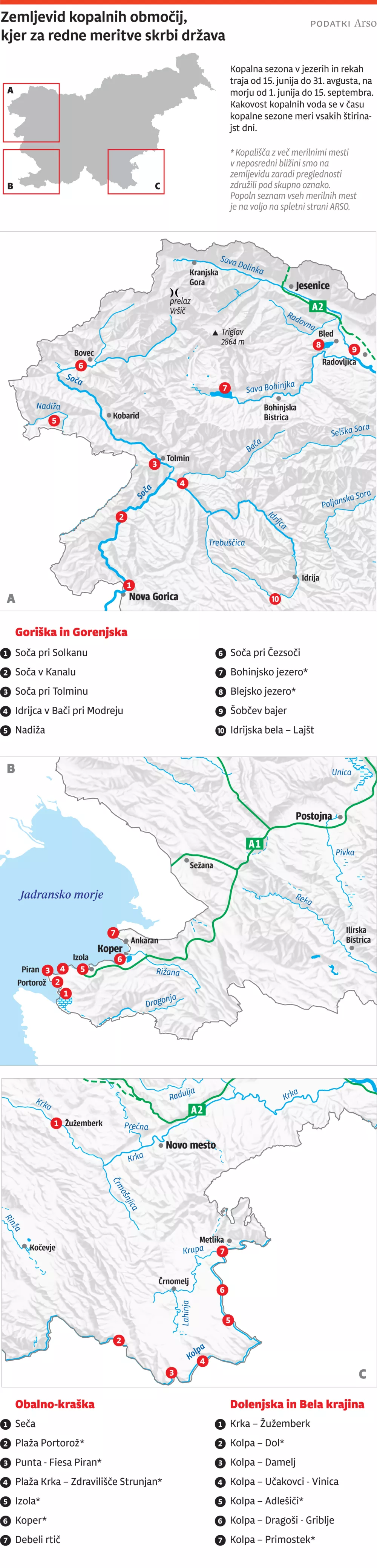 Letos je na seznamu 49 kopalnih voda: 21 ob morju ter 28 na rekah in jezerih, večinoma v gorenjski, goriški, obalno-kraški in dolenjski regiji ter Beli krajini.