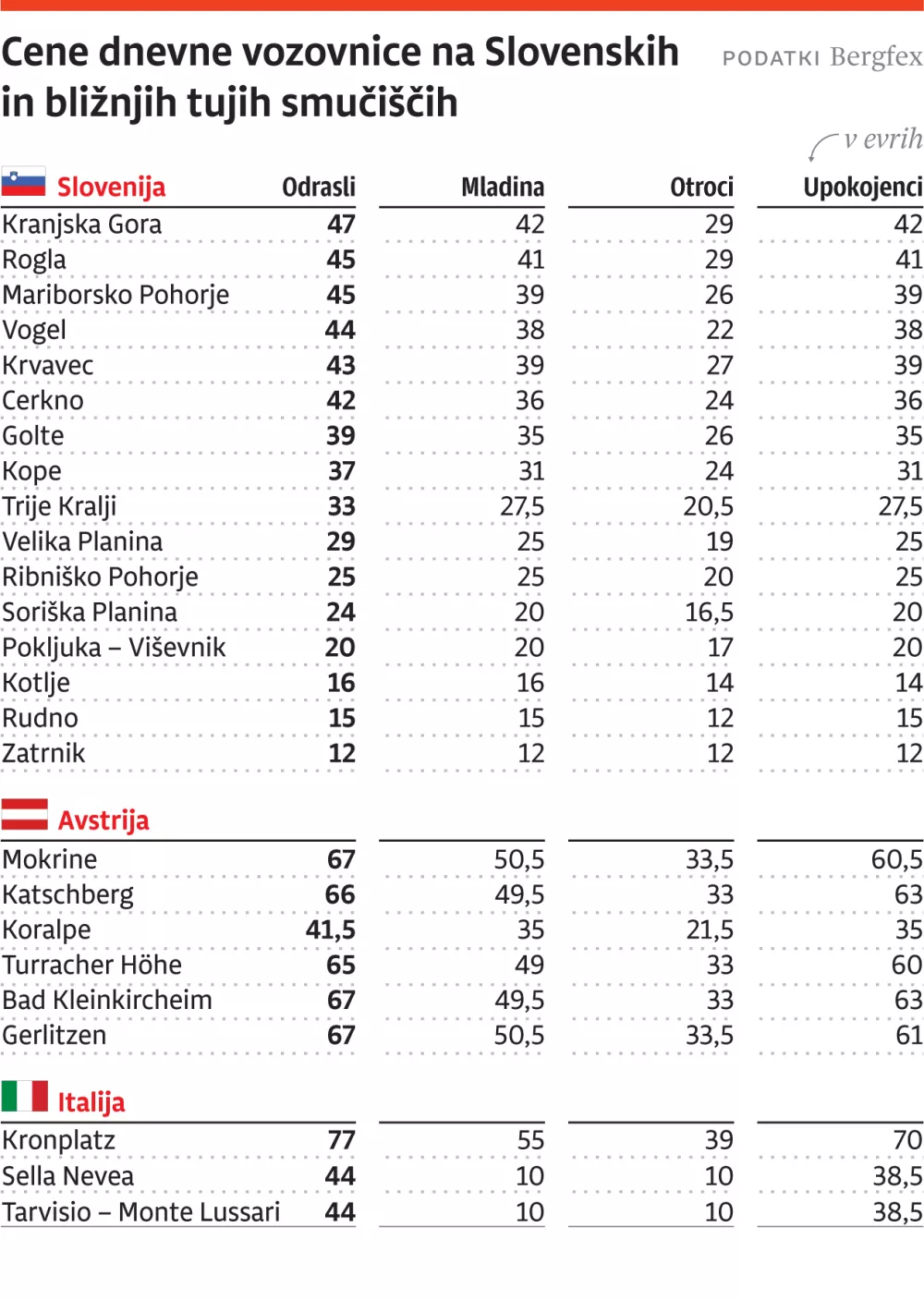 Kranjska Gora je sicer glede na dnevno vozovnico najdražje slovensko smučišče, čeprav razlike niso tako velike, saj bomo za smuko v naših večjih centrih plačali med 37 in 47 evri na osebo. Za mladostnike se bodo vozovnice gibale med 31 in 42 evri, za otroke od 24 do 29 evrov. Posebne cene vozovnic majo tudi upokojenci, povečini so enake kot za mladostnike.