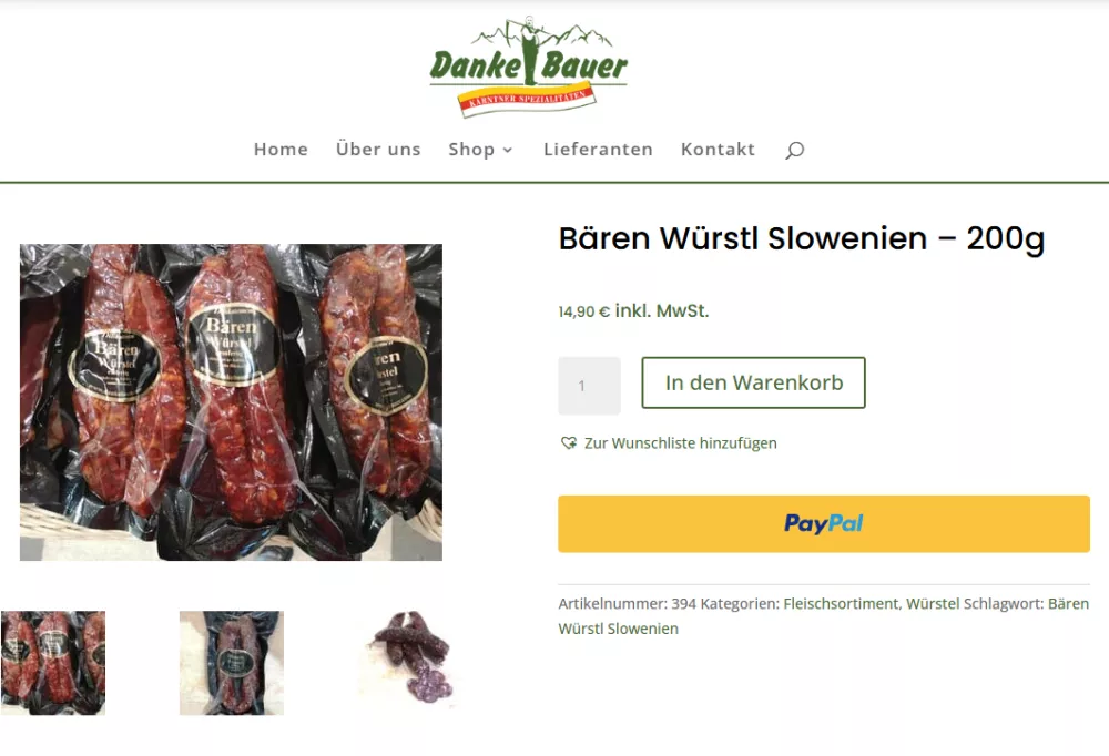 Trgovec je na svoji spletni strani medvedje klobase oglaševal kot edinstveno poslastico, ki navdušuje z okusom, kakovostjo in tradicijo. Hkrati je poudarjal tudi, da vsak lovec, ki je kdaj ubil medveda, prisega na moč medvedjega mesa. S tem je seveda namigoval, da medvedje meso pomaga pri dvigu moške potence, poroča Kronen Zeitung. Sporne zapise je medtem umaknil, 200 gramske medvedje klobase iz Slovenije pa prodaja še naprej. Trgovec tudi poudarja, da ima zaščita rjavega medveda v Sloveniji pomembno vlogo in da je odstrel živali strogo reguliran.