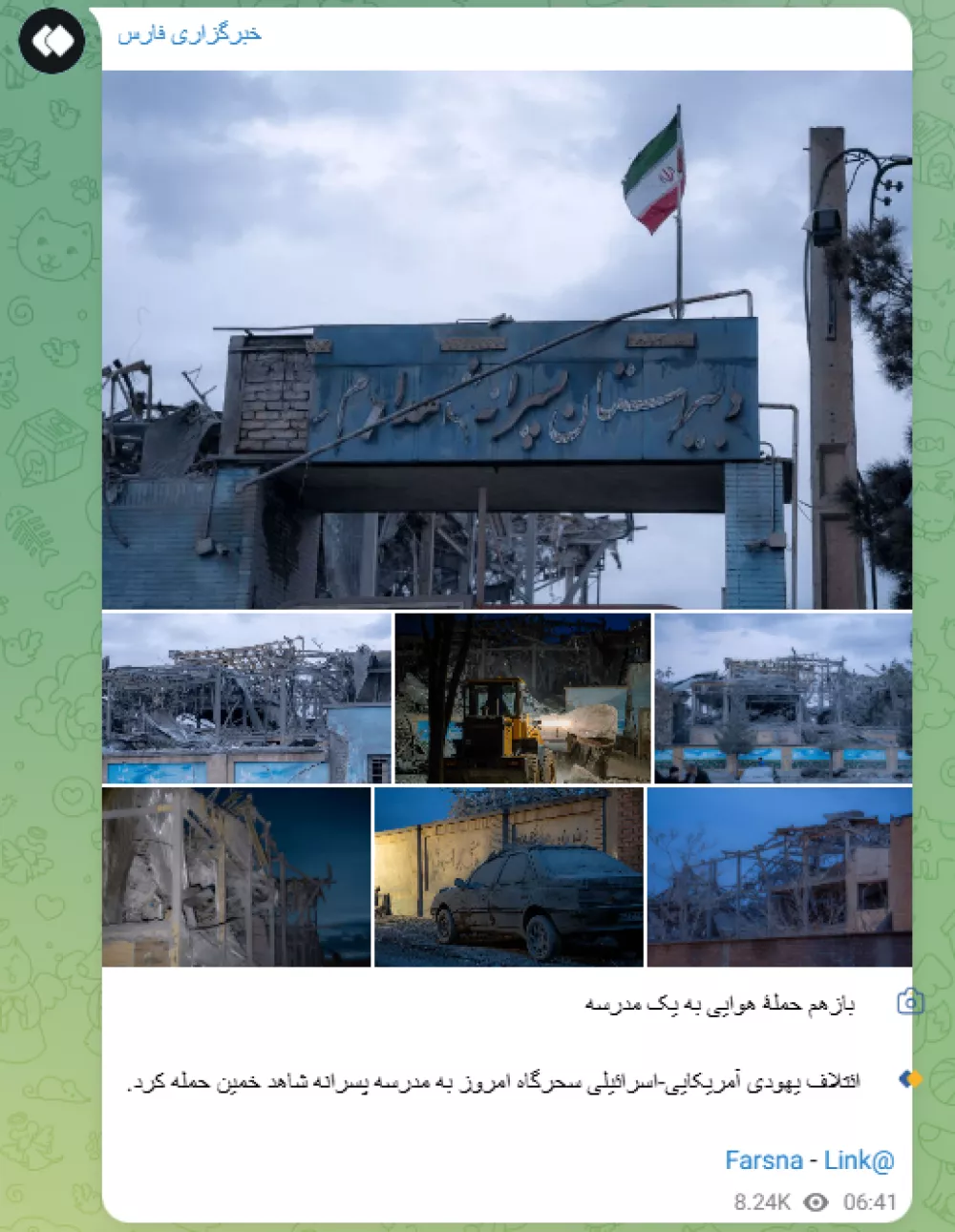 Objavljene so bile tudi fotografije, ki prikazujejo precejšnje uničenje šolske zgradbe, poročajo iranske tiskovne agencije in Index. Iransko društvo Rdečega polmeseca je prav tako poročalo o napadu in na telegramu delilo iste fotografije, ki jih je prej objavila agencija Fars. Ob slikah je bil napis: »Zračni napad na šolo v Homeinu.«