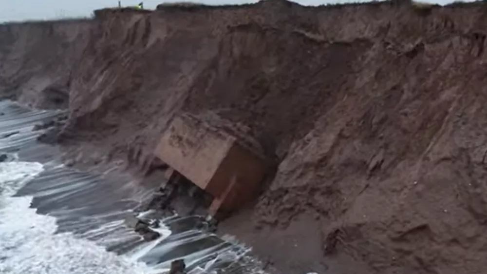 Opečnata stavba v bližini vasi Tunstall na obali vzhodnega Yorkshira, ki je bila stara približno 70 let, je bila zgrajena kot opazovalnica v primeru jedrske vojne. Bunker je bil nagnjen na rob pečine in le še vprašanje časa je bilo, kdaj bo zgrmel v prepad.