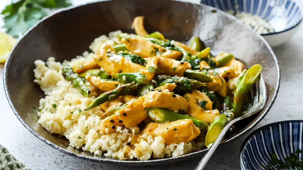 Cvetačni riž – ali katero koli drugo prilogo, servirajte na krožnik, prelijte z omako, okrasite s sezamom, svežim peteršiljem in čilijevimi kosmiči ter takoj postrezite.