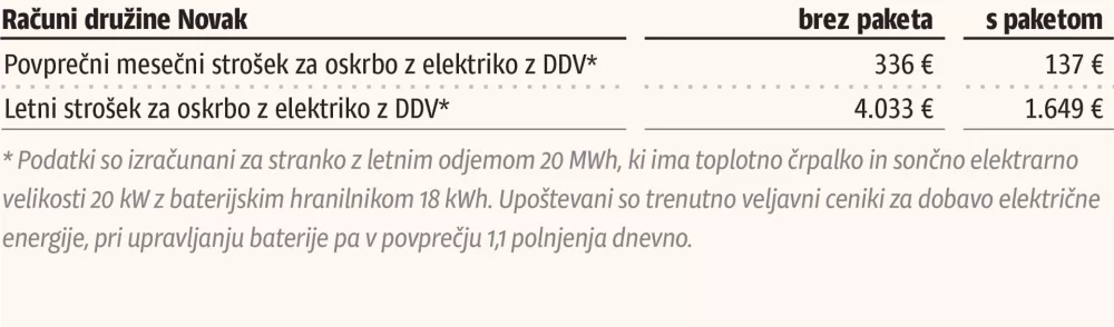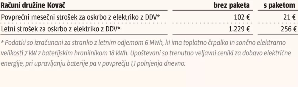 Družina Kovač živi v nizkoenergijski hiši in letno porabi približno 6.000 kWh elektrike, pri čemer za ogrevanje uporabljajo toplotno črpalko. Pred odločitvijo za paket Pametna samooskrba so za elektriko plačevali 1.229  € na leto. Danes, zahvaljujoč lastni sončni elektrarni in naprednemu upravljanju baterijskega hranilnika, znaša njihov letni strošek le še 256 € – to pomeni kar973 € letnega prihranka oziroma 79 % nižji strošek za elektriko.