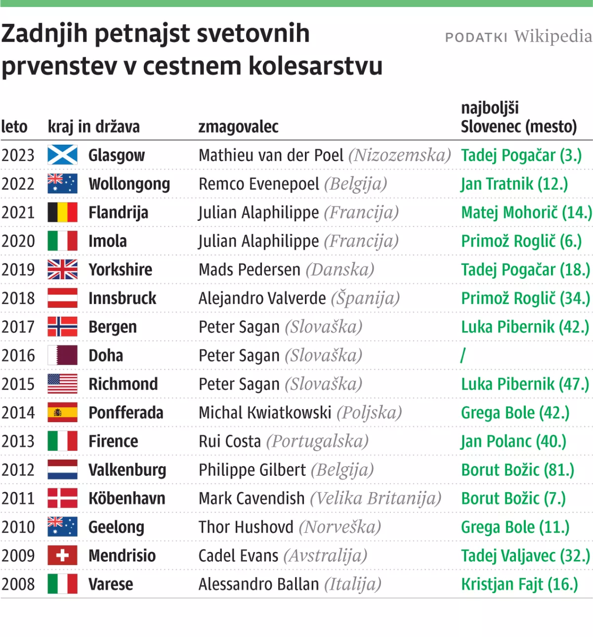 Drugi med petimi kolesarji, ki se lahko pohvali s tremi naslovi in je pomemben za današnje kolesarstvo, je Eddy Merckx. Belgijski kanibal je v svojem času dirkal v slogu danes najboljšega kolesarja na svetu Tadeja Pogačarja. Blestel je na enodnevnih in najtežjih etapnih dirkah. Vedno je bil napadalen in zato ni prav nič čudno, da svetovni mediji danes radi primerjajo dosežke Pogija in Merckxa. »Seveda mi laska, ko me primerjajo s takšnimi asi kolesarstva, a mislim, da se takratnega obdobja z današnjim ne da primerjati,« je že večkrat svoje mnenje o primerjavah povedal Tadej Pogačar. A dejstvo je, da je Pogi letos v Zürichu prvi favorit za končno zmago in se na tak način lahko še korak približa vsem uspehom Belgijca. Slovenija ima za zdaj na svetovnih prvenstvih dve kolajni. Za prvo je leta 2021 v Lizboni poskrbel Andrej Hauptman, ki je bil bronast. Prav tako tretji pa je bil lani v Glasgowu Tadej Pogačar. Do sedaj so svetovni prvaki postali kolesarji iz sedemnajstih različnih držav, Pogi pa je odločen, da bo v Švici donela Zdravljica in tako osemnajsta različna državna himna v čast zmagovalcu.