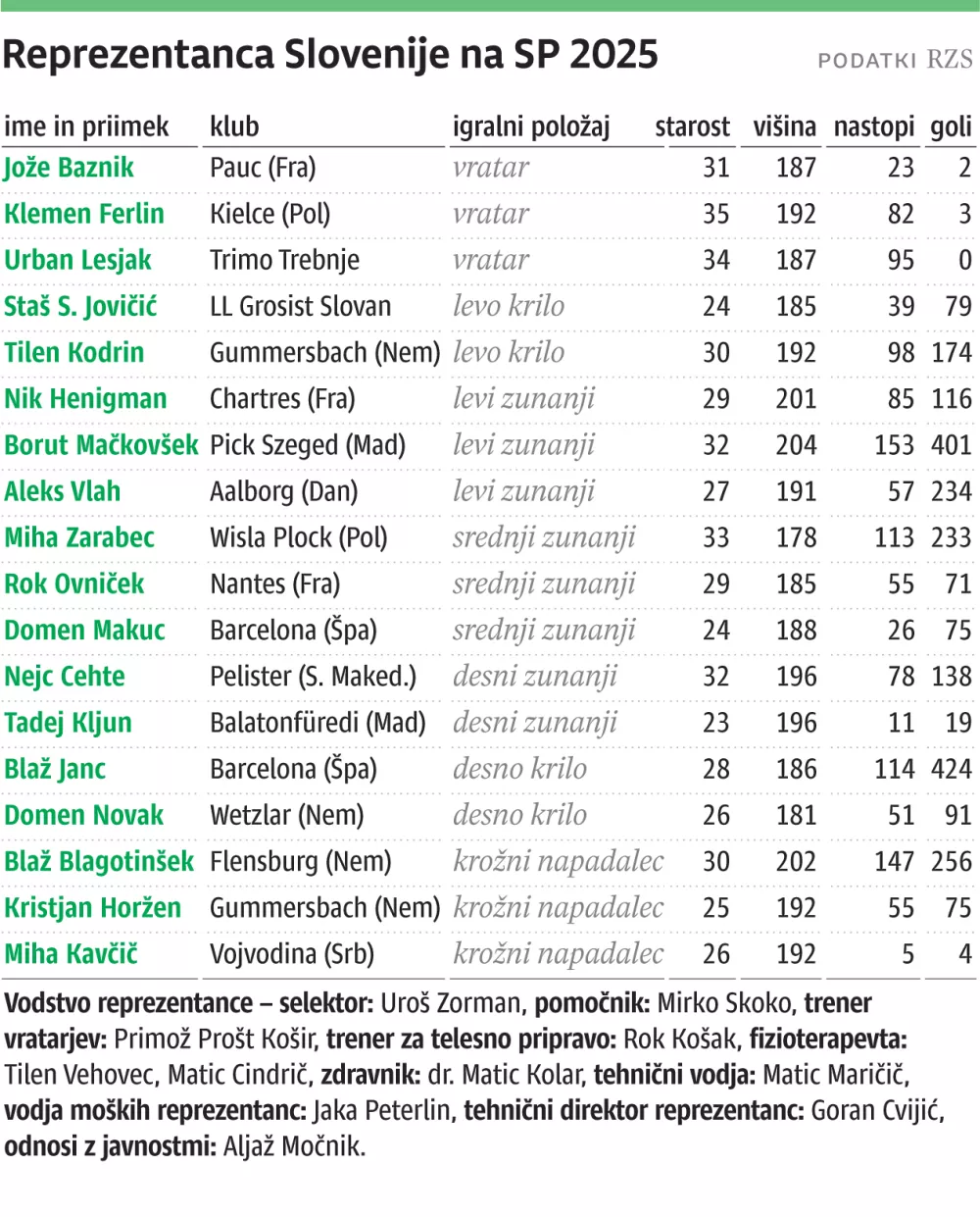 Vratar Urban Lesjak je s slabimi 34 leti in pol za leto mlajši od stanovskega kolega Klemna Ferlina (ubada se z lažjo poškodbo, a naj bi bil povsem nared), najstarejšega med 18 Zormanovimi igralci in edinega, ki je starejši od letnika 1990. »Na SP ni več reprezentanc, ki bi jih zlahka premagoval s 15, 20 goli razlike. Rokomet je globalni šport in o lahkih zmagah ne razmišljamo. Za vsako zmago se bo potrebno precej oznojiti in stepsti na igrišču. Dobro smo trenirali, kar mogoče na pripravljalnih tekmah ni bilo videti. A tudi pred OI v Parizu nismo blesteli, nato pa smo bili iz tekme v tekmo boljši. Razpored tekem v skupini nam gre na roko. Nikogar ne podcenjujemo, a uvodni tekmi proti Kubi in Zelenortskim otokom moramo dobili, do Islandije pa bomo že v pravi formi,« meni Urban Lesjak, ki je pred letošnjo sezono po dveh letih igranja za Pelister iz Bitolja okrepil trebanjski Trimo.
