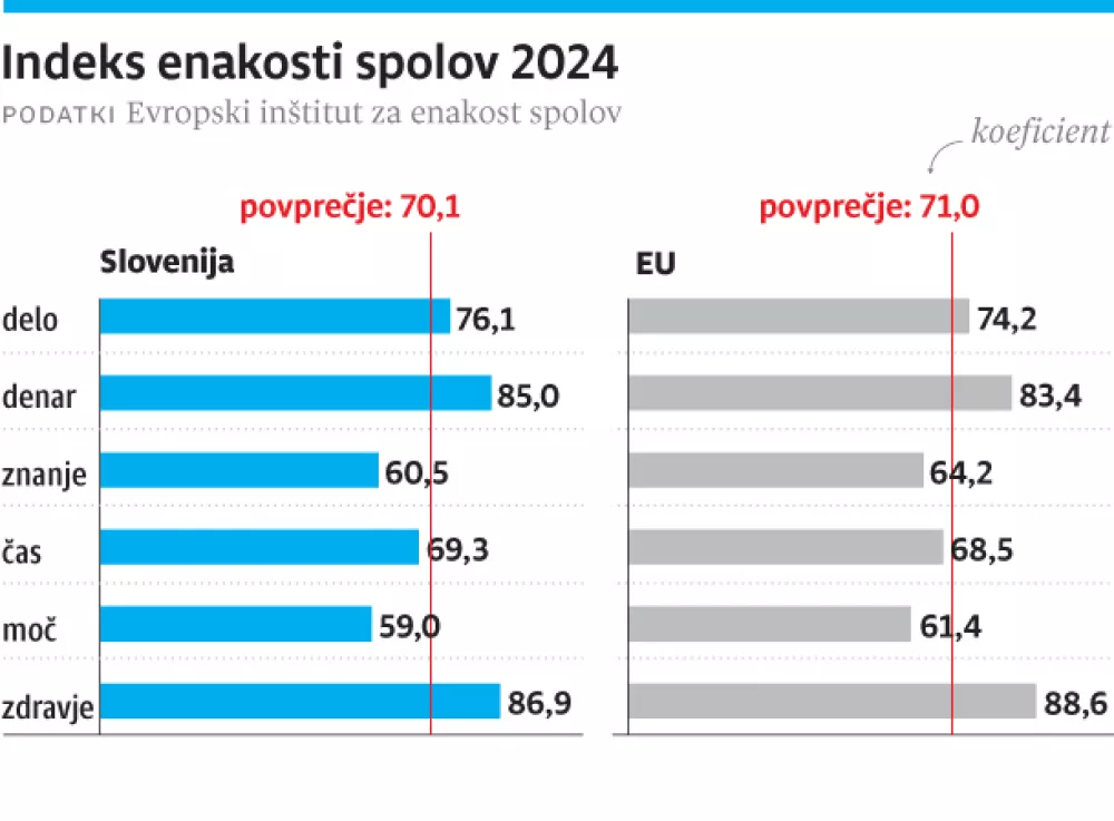 Države članice EU so ocenjene z oceno od 1 do 100, pri čemer 1 pomeni popolno neenakost, 100 pa popolno enakost. Naša država je v letu 2024 presegla 70 točk, natančneje 70,1 točke, kar je 0,7 točke več v primerjavi z minulim letom. To jo že nekaj let zapored umešča na 12. mesto, tik pod povprečje EU, ki je 71 točk.